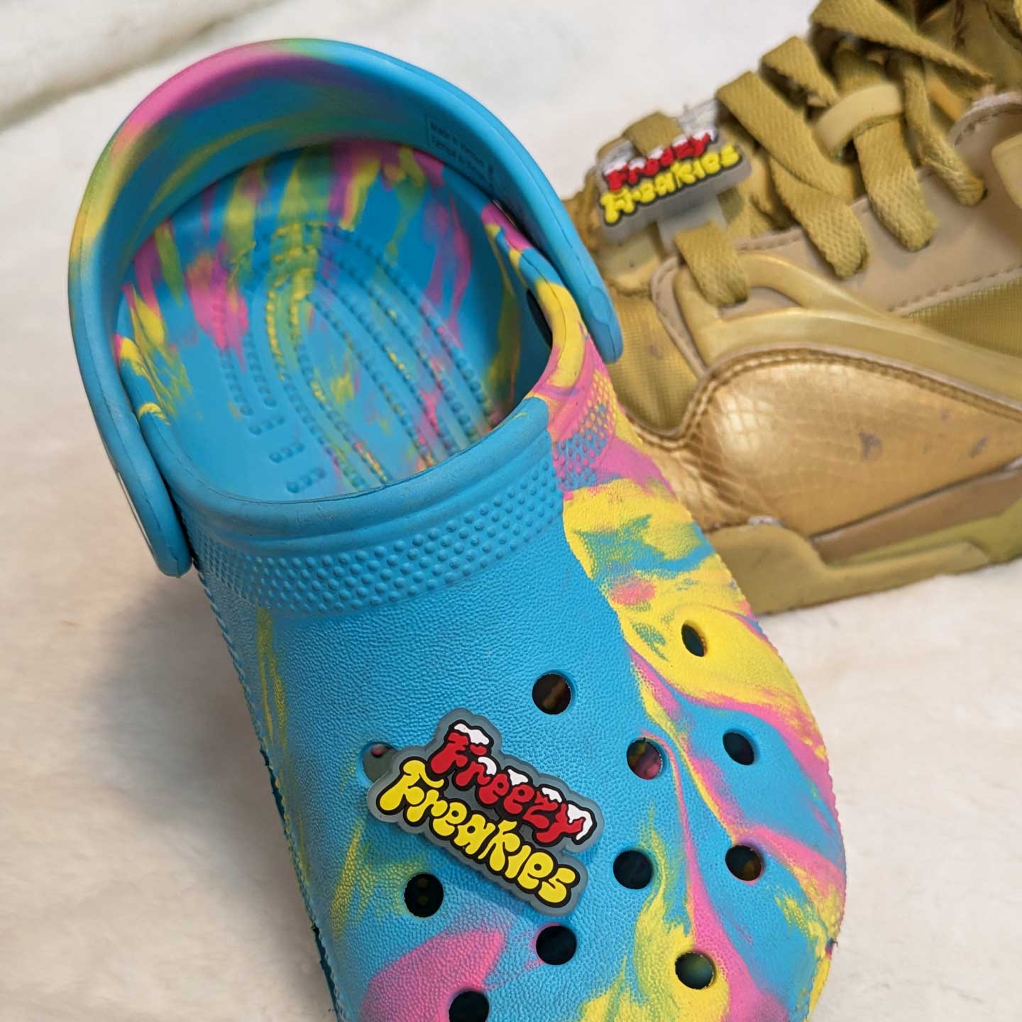 Day or night. Shoes or clogs. These Freezy Freakies shoe charms are as versatile as they are rad. The backside features a normal stud that fits into those holes found on clogs, as well as a removable accessory that lets you attach the charm to shoelaces. Plus they glow in the dark, which might be our second favorite color-changing effect.